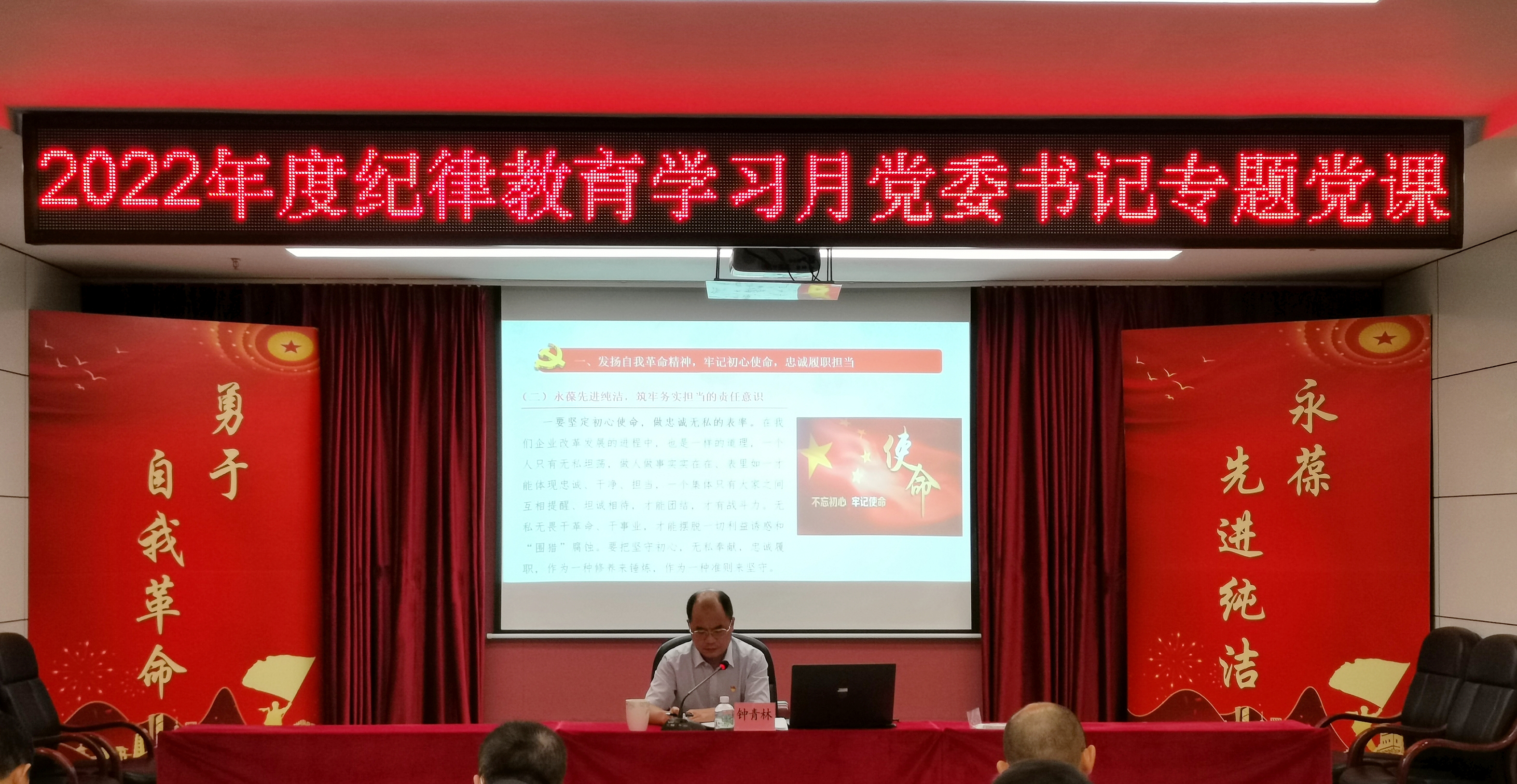 9月9日上午,为深入学习十九届六中全会精神,贯彻落实广东省第十三次党代会精神,坚定不移推进党风廉政建设和全面从严治党向纵深发展,强化招标中心全体党员干部的党性修养和纪律规矩意识,夯实廉洁从业思想,根据广新集团党委党风廉政建设和反腐败工作会议精神,结合招标中心党委召开的纪律教育学习月动员会工作部署,招标中心党委书记、董事长钟青林围绕“勇于自我革命,永葆先进纯洁”主题,开展题为《发扬自我革命精神 永葆开拓奋斗激情——为推动公司业务高质量发展贡献力量》的专题党课。