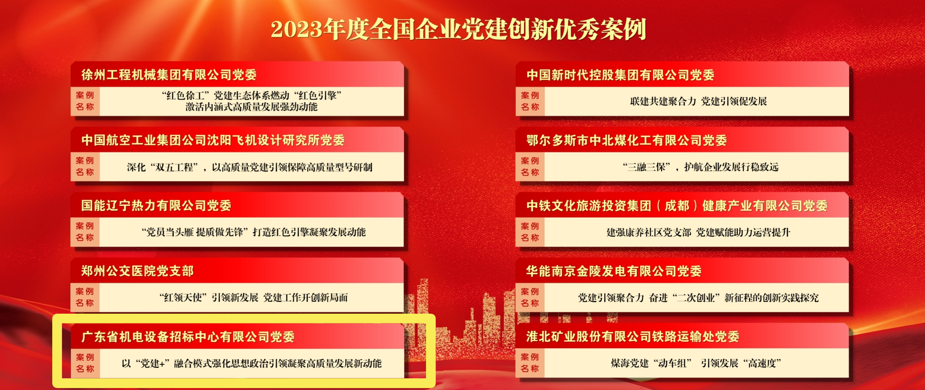 本次研讨会由求是网指导,由全国企业党建创新优秀案例征集活动发起单位——《中国企业报》集团、北京大学马克思主义学院、红旗出版社共同主办,由中企党建研究院承办。米兰手机登录入口党委《以“党建+”融合模式强化思想政治引领 凝聚高质量发展新动能》案例被评选为“2023年度全国企业党建创新优秀案例”。全国共评选优秀案例360个,其中广东37个,招标中心是全国招投标行业唯一入选企业。